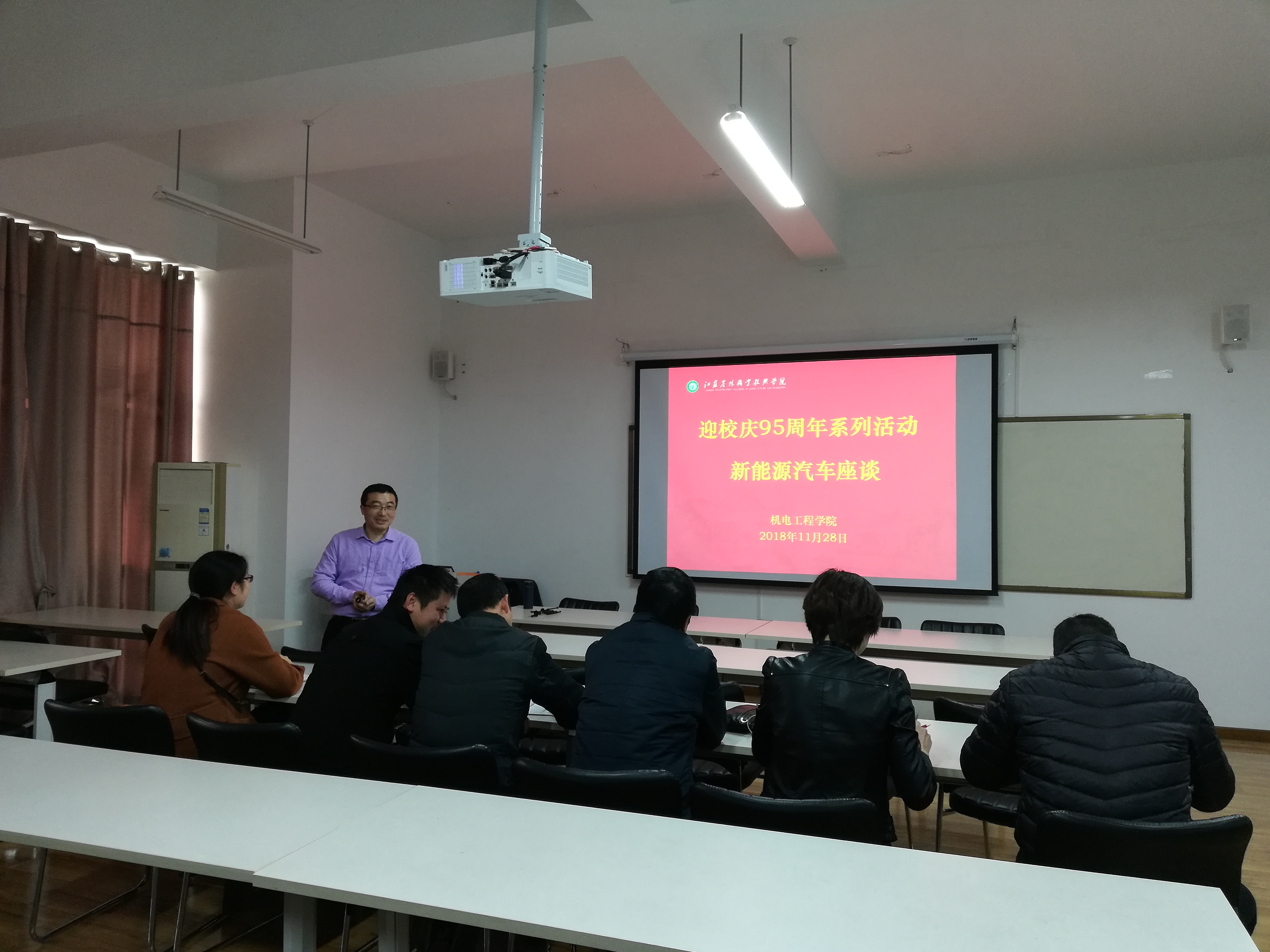2018年11月28日,由机电工程学院教工第一支部组织的迎校庆95周年活动——新能源汽车讲座,在工科楼A414举行。