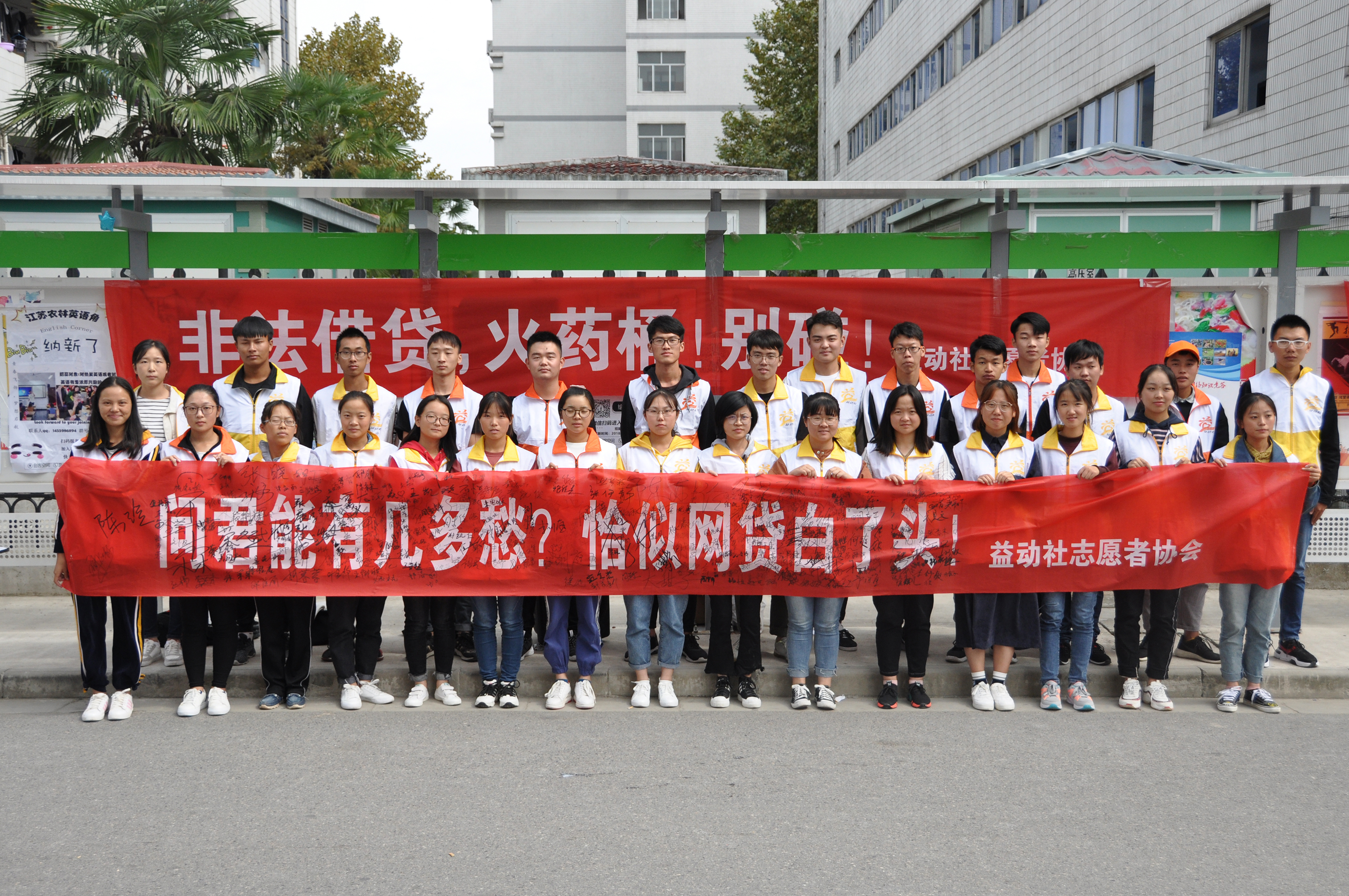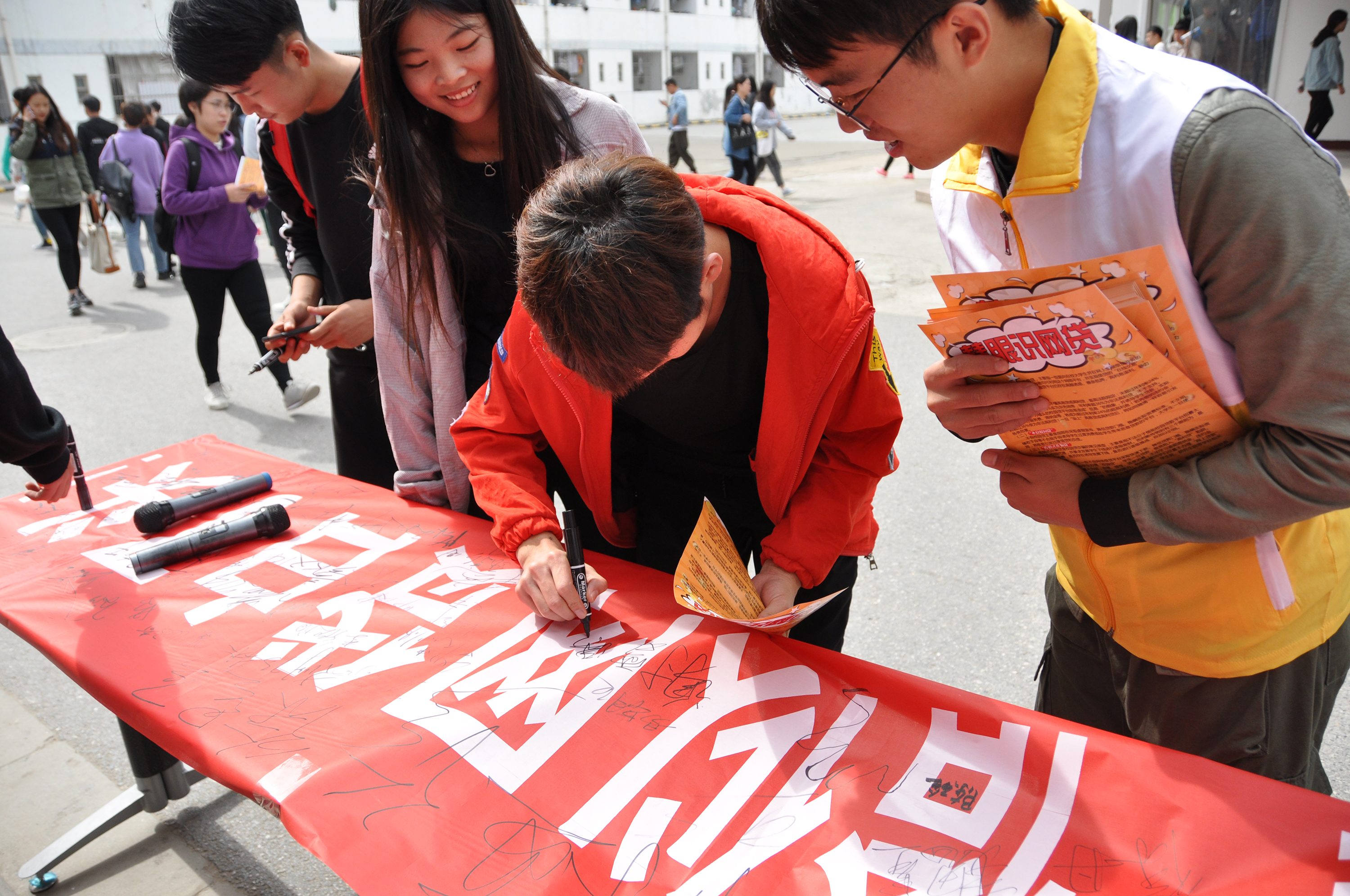 活动现场,印着警醒标语的横幅吸引了过往同学。益动社志愿者们精心设计的宣传页,将校园贷中存在诱惑逐一澄清,打消学生不切实际的想象。现场还随机调查了一些同学对校园贷的了解情况,志愿者耐心地向他们讲解了理解中的误区。同学们受教育后,在横幅上签下姓名,携手抵制校园贷,营造和谐、美好的校园生活。
