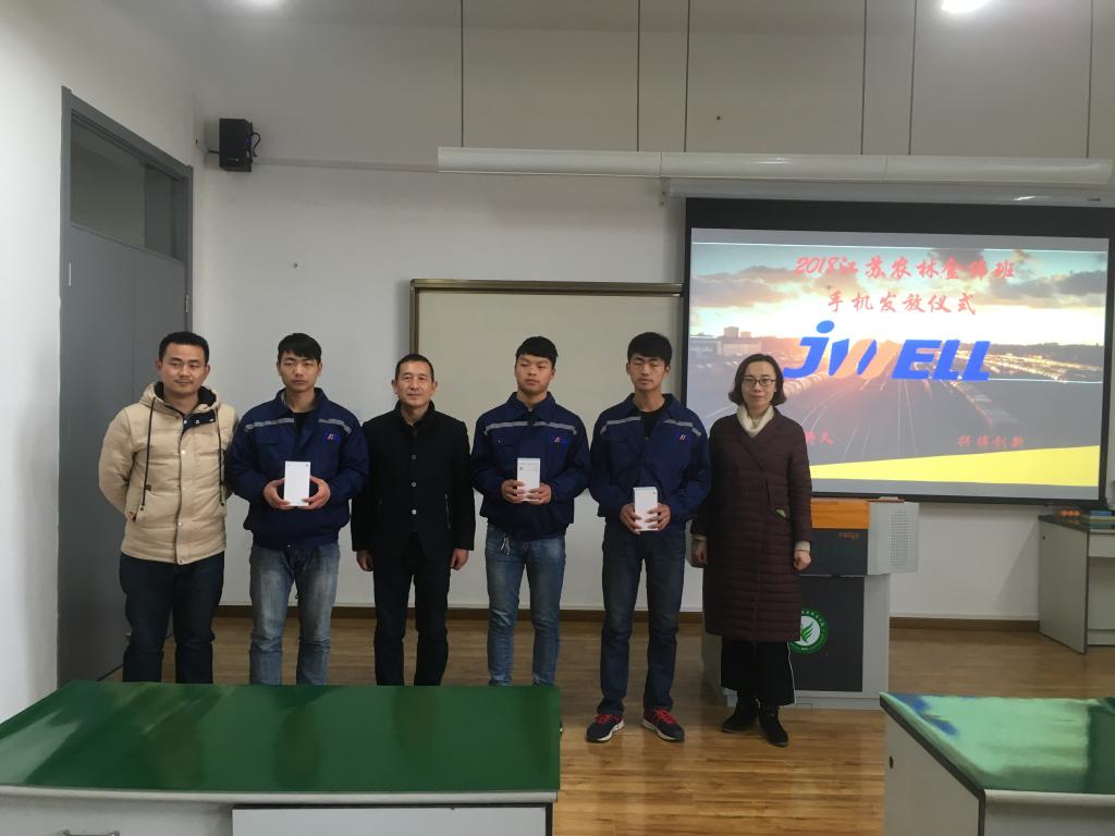 1月22日金纬机械(溧阳)有限公司胡如意副总经理一行三人为表达公司对金纬班同学的关怀,特为江苏农林职业技术学院机电工程学院17级金纬班优秀学生发放价值3488元/部的华为P10手机。