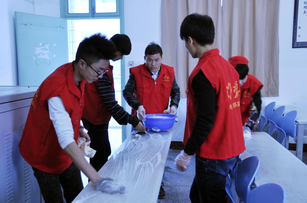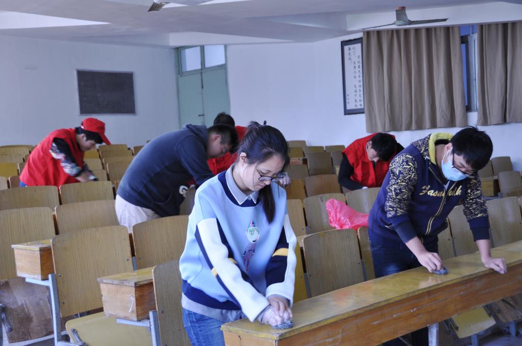 经过精心的准备,细致的分工,志愿者们井然有序地打扫着教室。大家挽起袖口,努力把桌面的涂鸦擦去,将桌椅整齐排列。过程虽然辛苦,但大家仍无怨无悔,只为给同学们留下明、净、美的学习环境。