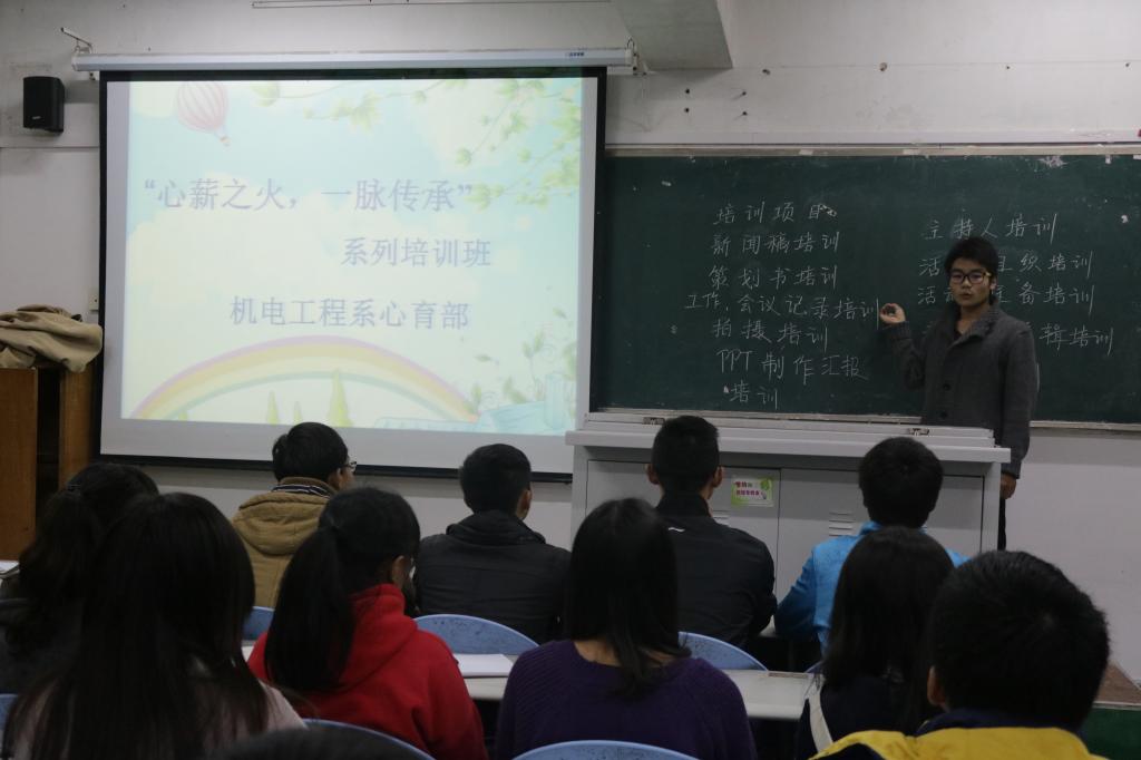 为了提高机电工程系心育干部的综合素质,加强大学生服务站心理健康宣传力度,11月22日-12月3日,机电工程系心育部开办了“心薪之火,一脉相承”系列技能培训班。参与本次培训的是心育部与大学生服务站全体成员。