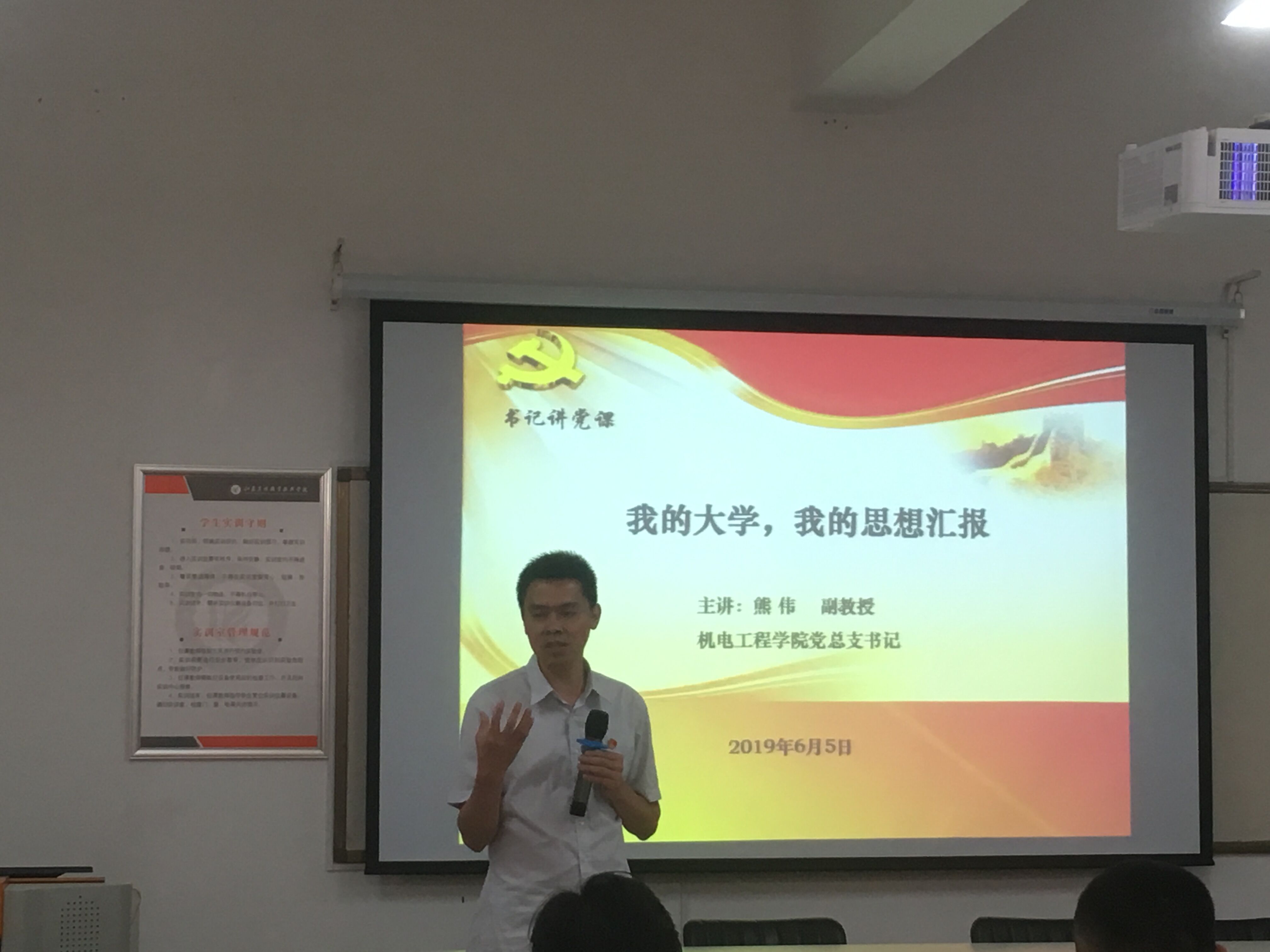 6月5日,机电工程学院党总支书记熊伟同志为学生代表做以“我的大学,我的思想汇报”为题的党课教育。