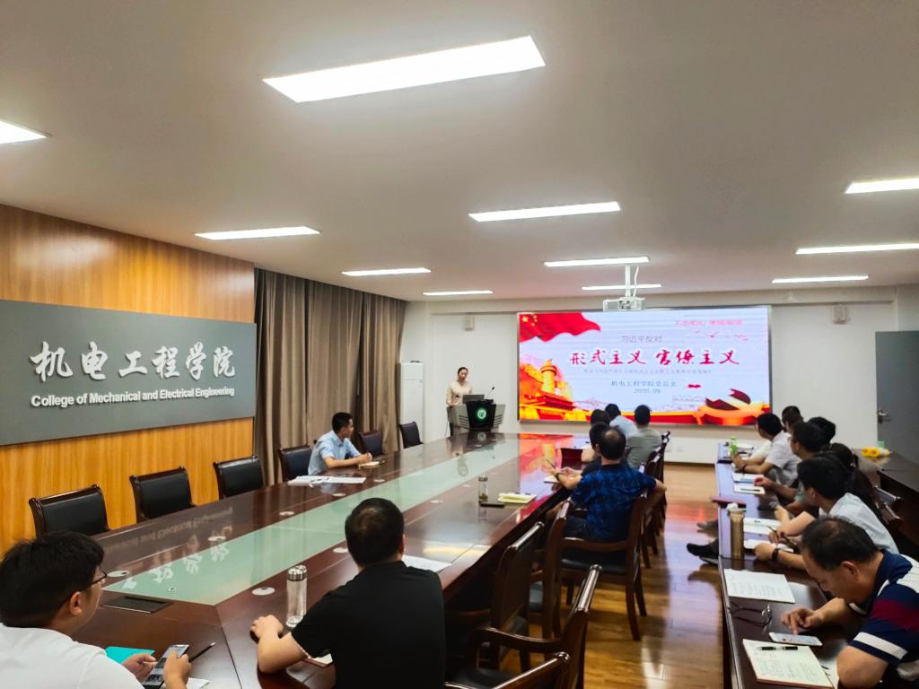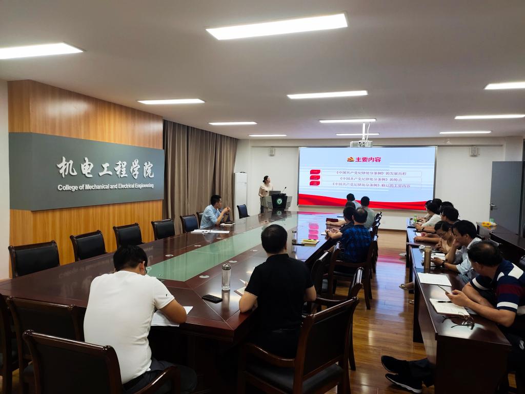 9月24日机电工程学院在学院会议室组织了全体党员、骨干教师集中学习了《中国共产党纪律处分条例》和《习近平关于力戒形式主义官僚主义重要论述》等。此次学习采取课件讲授加警示案例的方式,以案明纪,举一反三,收到了良好的教育效果。