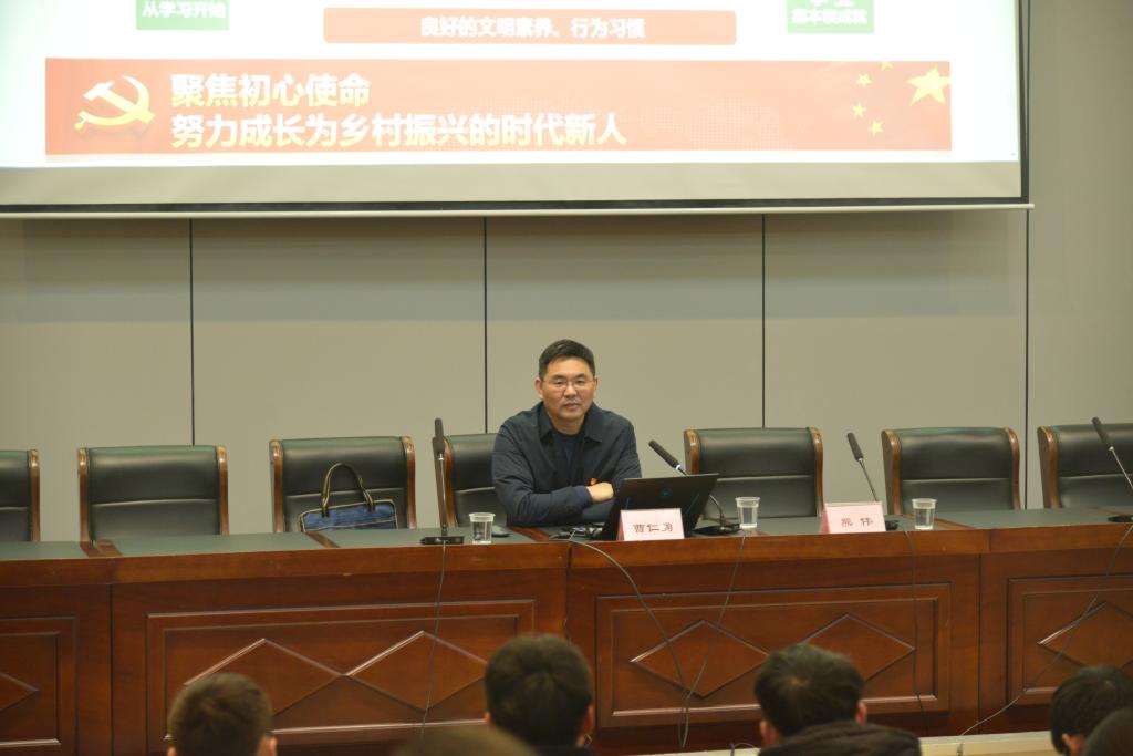12月16日下午,机电工程学院邀请曹仁勇副校长为学院青年学子上了一堂题为“聚焦初心使命,努力成长为乡村振兴的时代新人”的专题党课。活动由学院党总支书记熊伟主持,全院130余名学生党员、发展对象、积极分子和学生干部一同听取了讲座。