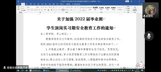 会上,高菊玲副院长就学校下发的《加强2022届毕业班学生顶岗实习期安全教育工作的通知》给大家做了解读,要求毕业班班主任召开专题班会,联系到每一个学生,全面了解和掌握学生实习状况、思想状况、毕业论文完成情况等。随后,徐荣丽老师对工学云平台上的任务分工、注意事项等做了简单介绍,钱多副书记要求各位班主任梳理班级学生的就业数据,关心有就业困难的学生,为学生做好暖心服务。最后张田林书记指出,班主任作为班级的第一责任人,思想上要高度重视,通过电话、微信、QQ等方式关心每一位毕业生,真正把班主任工作做细做实。(撰稿:徐荣丽 审核:高菊玲 上传:胡程磊)