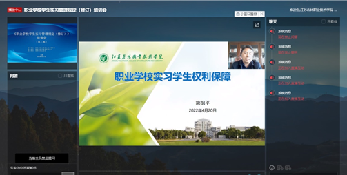 2022年4月27日上午,根据教务处统一要求,机电工程学院组织相关教师参加了《职业学校学生实习管理规定(修订)》线上培训会,部门负责人、实习班级班主任、实习指导教师共计45人参加了会议。