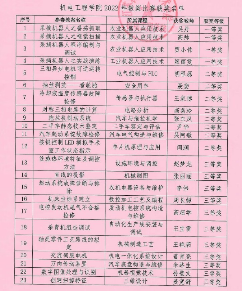 为切实推动机电工程学院教学质量提升,促进学院教师深入学习先进教育教学理念,转变教育教学观念,筑牢教学基本功,提升教学能力,机电工程学院于2022年11月开展教学质量提升系列活动之教师优秀教案评比。本次活动共收到38份教案,经过校外专家评选产生一等奖4项、二等奖8项、三等奖11项。