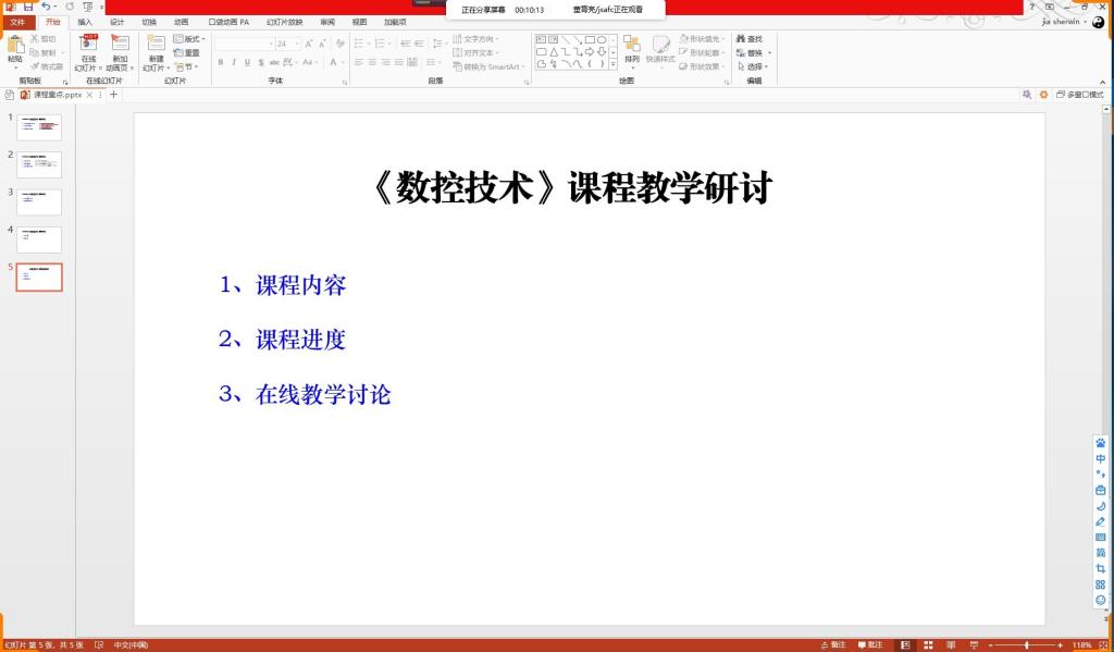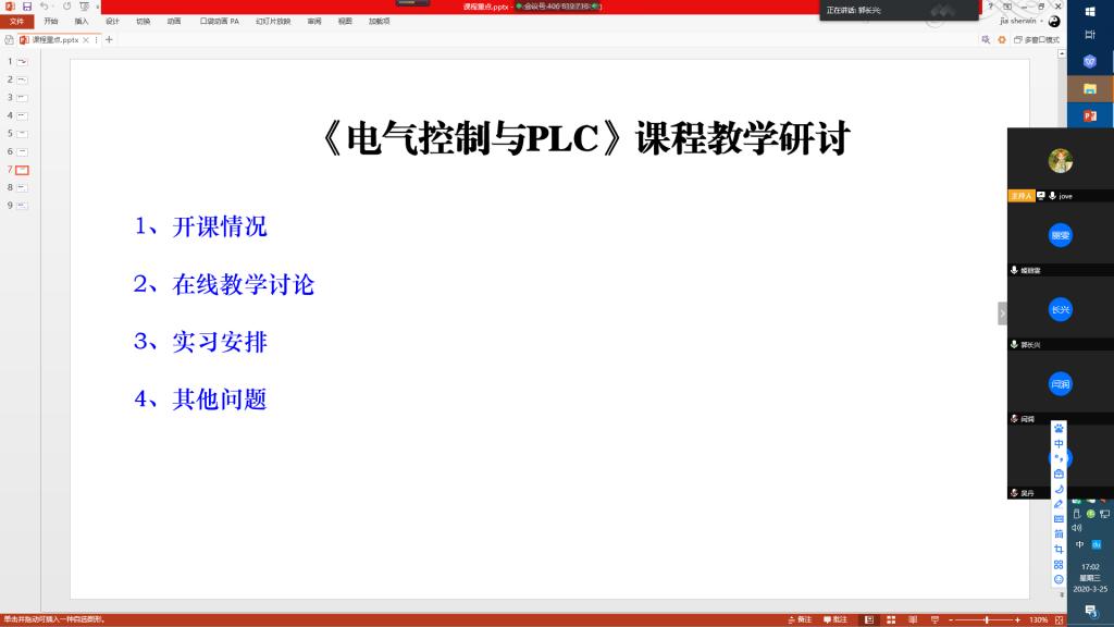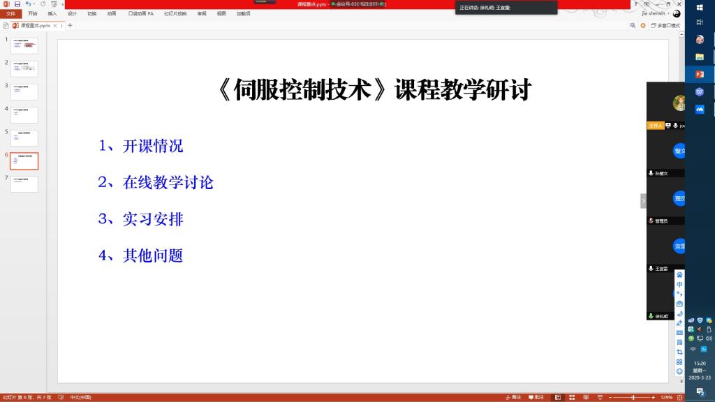 随着在线教学正常化,自动化教研室积极采用在线形式进行课程组教学研讨。由于疫情原因,老师都各自在家进行在线教学,形成信息孤岛,为了加强老师交流,促进老师完善在线教学课程,提升老师在线教学能力,自动化教研室组织《数控技术》、《伺服控制技术》、《电气控制与PLC》等课程老师开展在线教学研讨。经过研讨,老师们互相交流经验,进一步了解在线教学的策略和方法,提升在线教学能力。课程组老师还对教学实验实习进行了交流讨论,统一了思想,理清了实践安排,分工合作,共同完成,做好教育教学工作,为抗击疫情作出一份贡献。