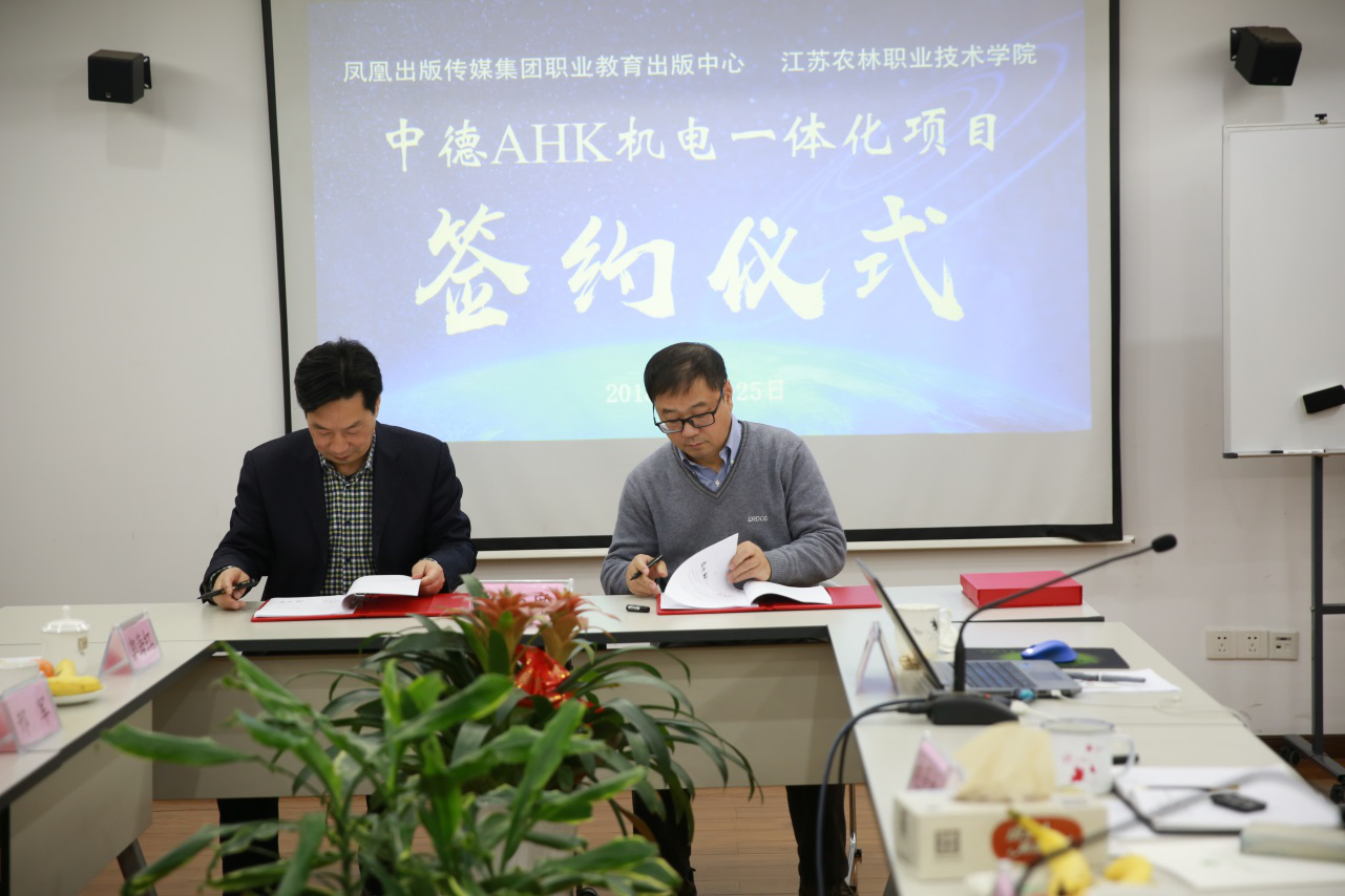 12月25日下午,我校与江苏凤凰职教共建中德AHK机电一体化合作项目签约仪式在南京凤凰职教公司举行。学校校长巫建华代表学校和凤凰职教总经理朱永贞签订了合作办学协议。学校副校长曹仁勇及国际交流中心、机电工程学院等相关部门负责人出席了签约仪式。中德AHK机电一体化项目是我校深入推进国际合作的新成果,也是我校专业建设与国际接轨的新突破。