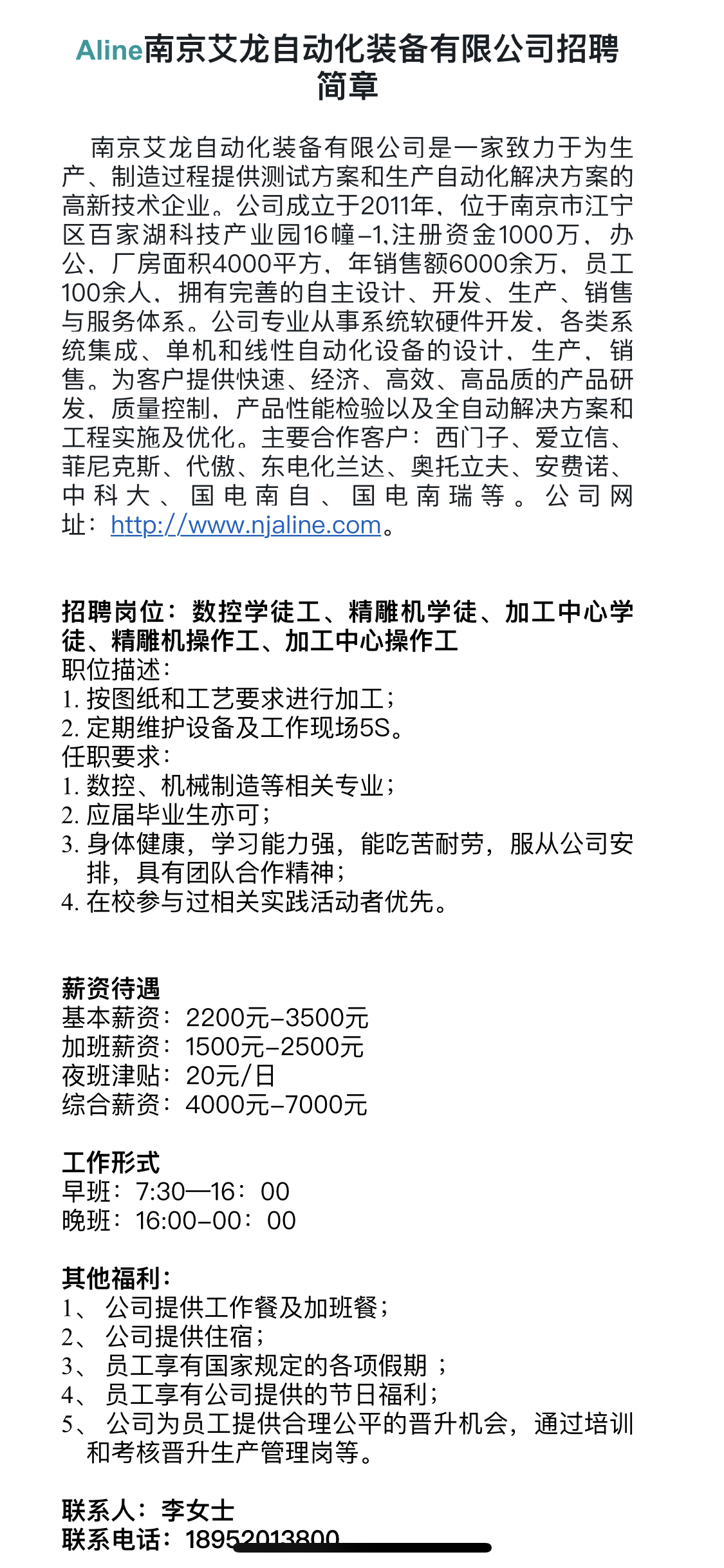 南京艾龙自动化装备有限公司招聘简章