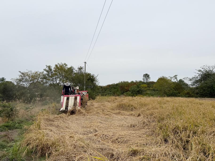 2025 年 10 月 29 日下午,几辆汽车从句容市区出发,在蜿蜒的乡间小路上七拐八绕近一小时,最终停在郭庄镇汤庄村的小路尽头。路边的水稻田里,正加紧赶工的村民们闻声抬头,满是尘土的脸上立刻绽开笑容,纷纷挥着手喊道:“欢迎江苏农林的老师和同学们,来帮我们收割水稻!” 收割队由江苏农林机电工程学院党总支教师和亚夫新农人学院农创班的各位同学组成,简单的招呼过后,师生们和村民们一同投入到紧张的水稻收割作业中。